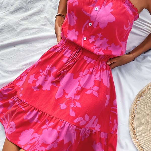 Fashion Floral Print Strapless Tie Waist Casual Dress