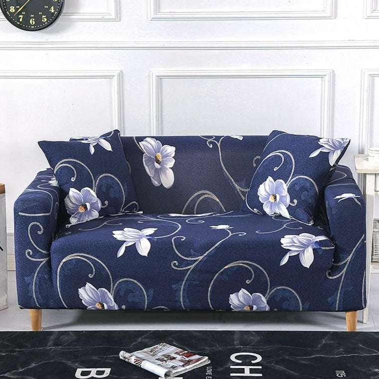 Compatible with most standard love seats and sofas, this Blue Floral Iris Pattern Sofa Cover is stylish, easy-to-install and will provide an elegant new look to your old, outdated couch. Ideal for renewing old furniture – or protecting new.