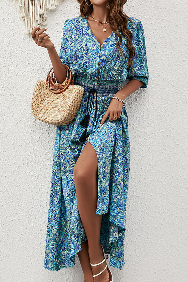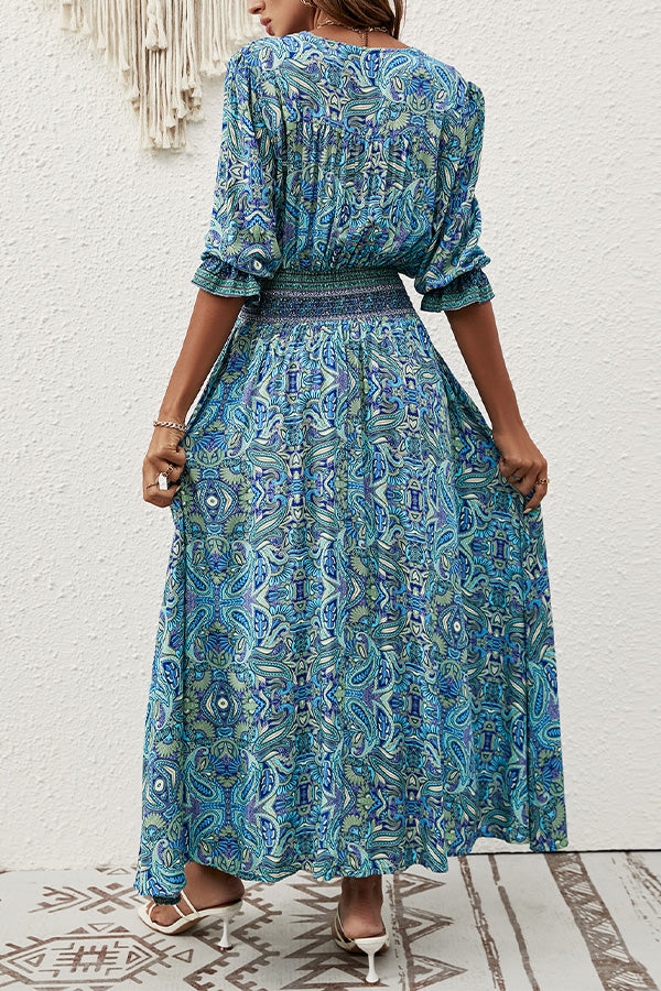 • Bohemia Print Long Sleeve Tie Waist Maxi Dress