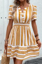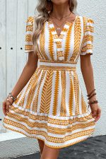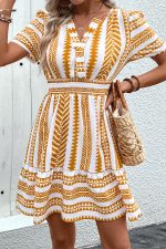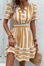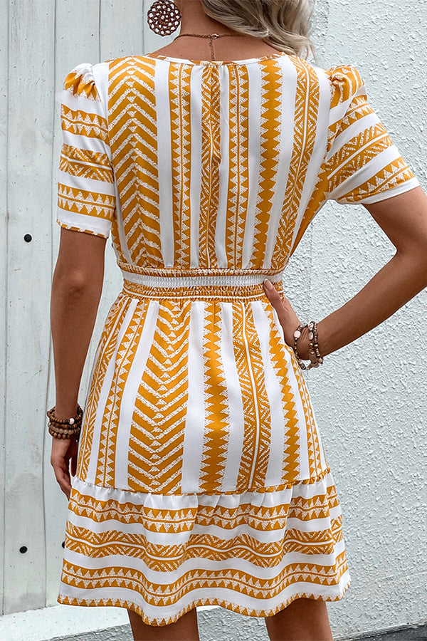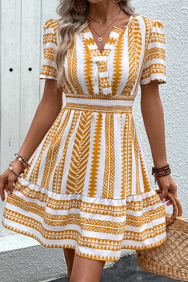 - Bohemia Print V Neck Smocked Waist Mini Dress