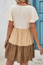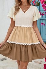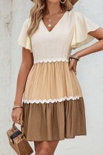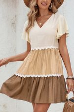- Color Block V Neck Ruffle Hem Casual Dress