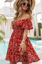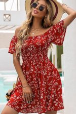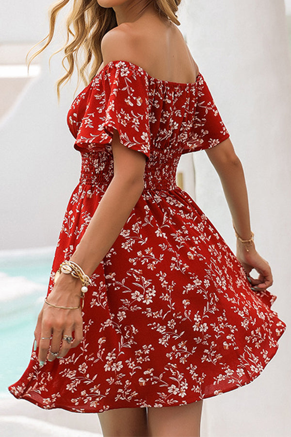 - Off The Shoulder Floral Print Smoked Waist Dress