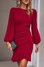 - Puff Sleeve Round Neck Solid Ruffle Hem Bodycon Dress