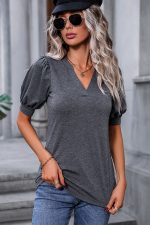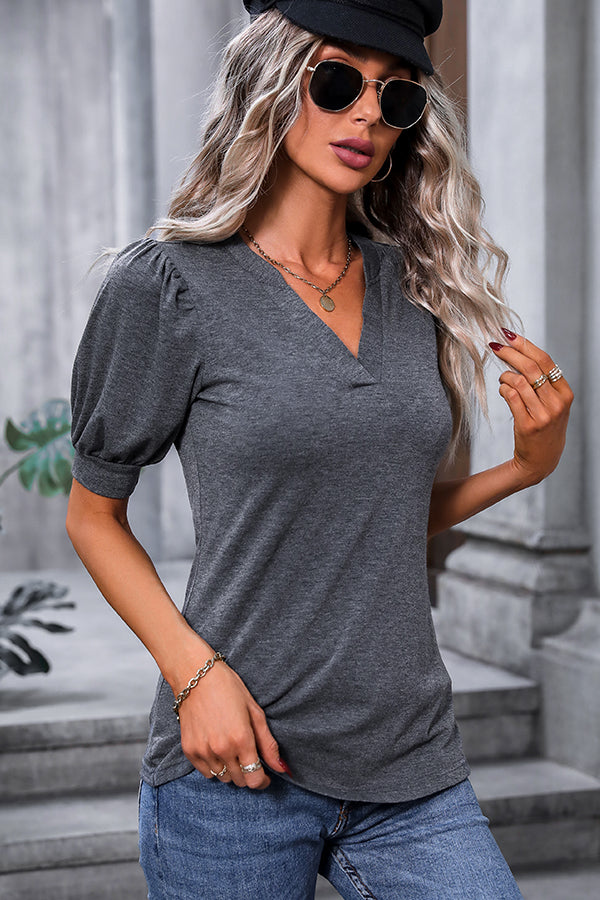 - Puff Sleeve Solid Color V Neck Casual Tops