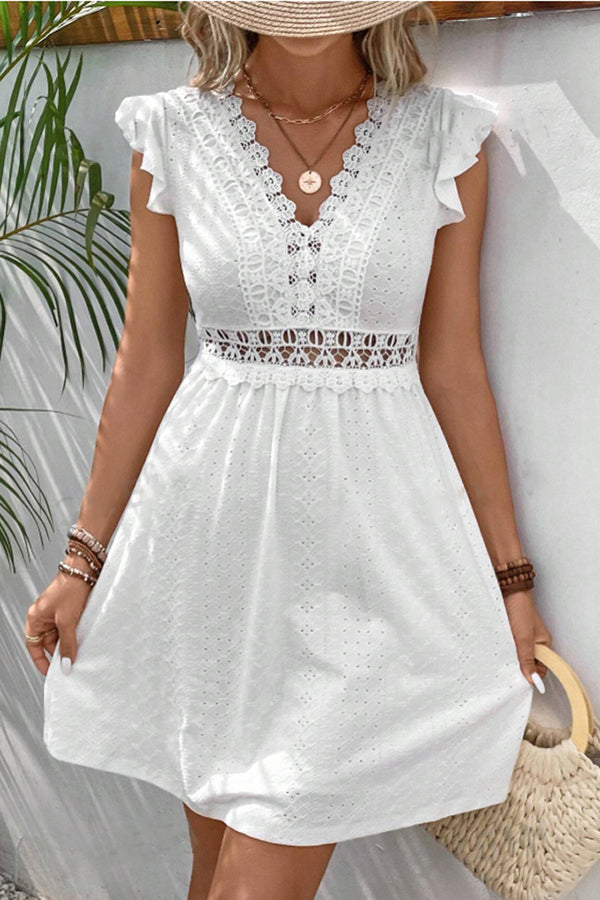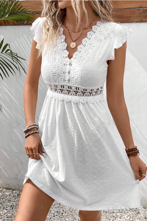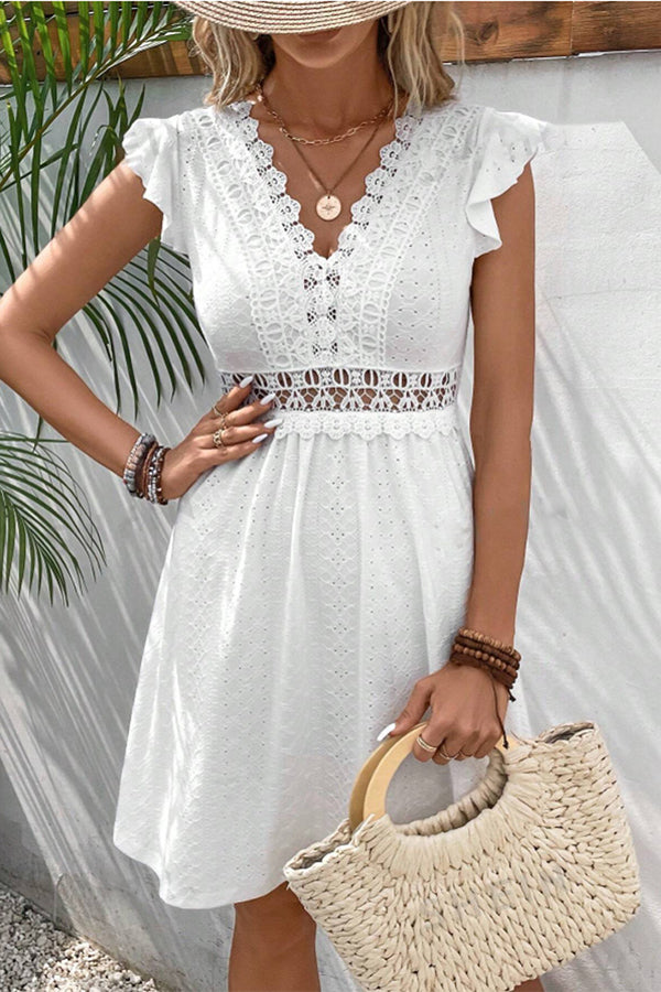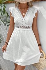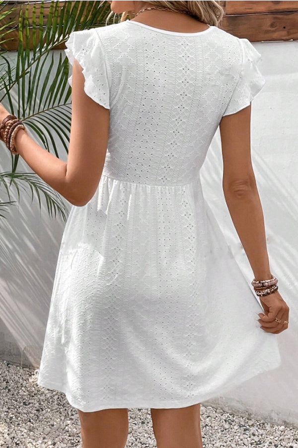 - Solid Color Flutter Sleeve Hollow Waist Casual Dress