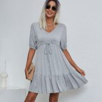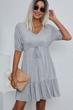 Be the first to review “V Neck Drawstring Waist Solid Casual Mini Dress”