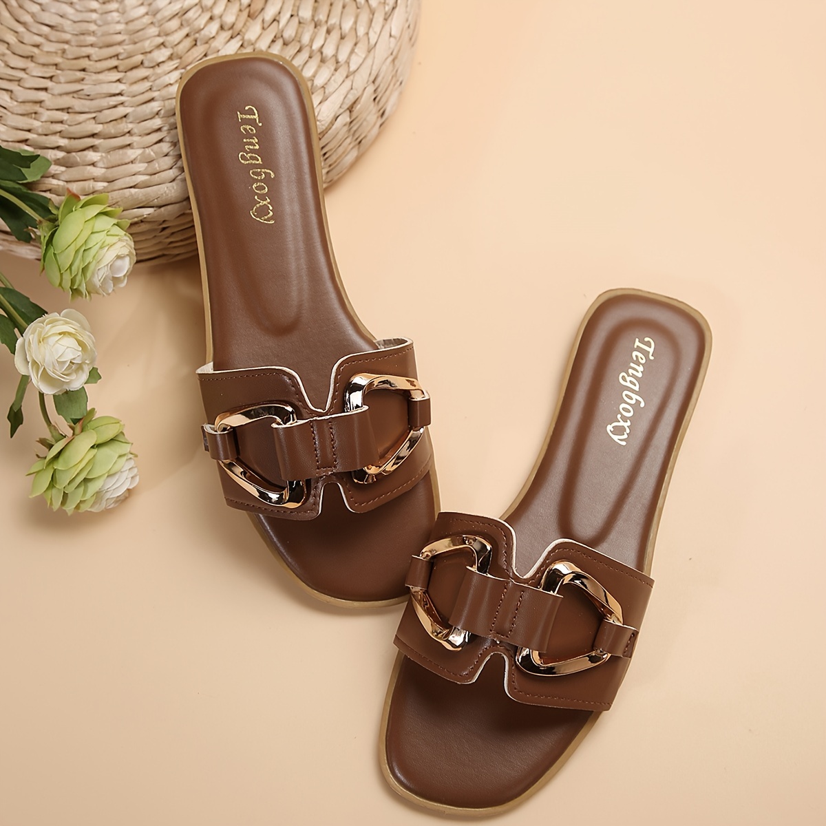 Women’s Metallic Buckle Decor Slides, Fashionable Square Open Toe Summer Shoes, Casual Beach Flat Slides