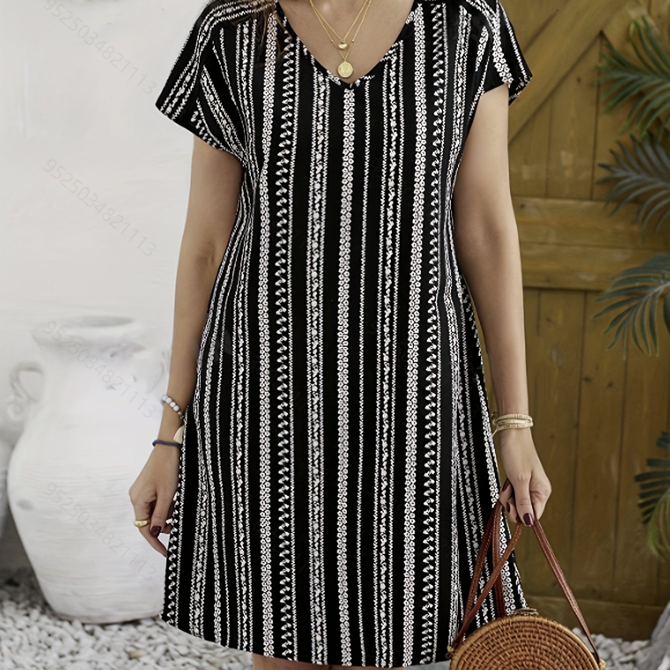Be the first to review “Allover Print V-neck Dress, Vacation Short Sleeve Dress For Summer & Spring, Women’s Clothing” Cancel reply