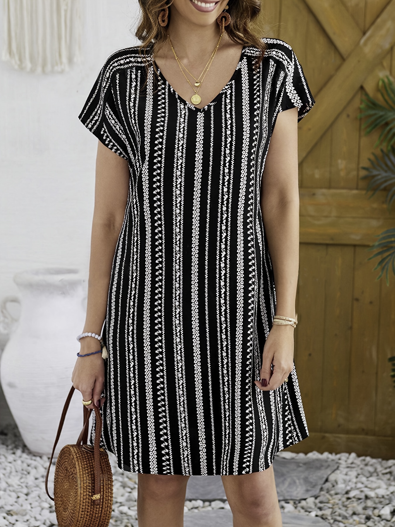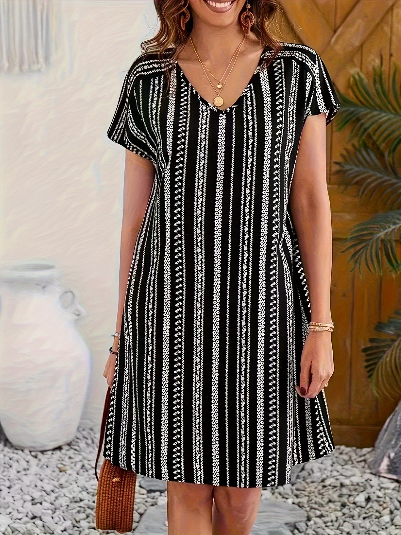 Allover Print V-neck Dress, Vacation Short Sleeve Dress For Summer & Spring, Women’s Clothing