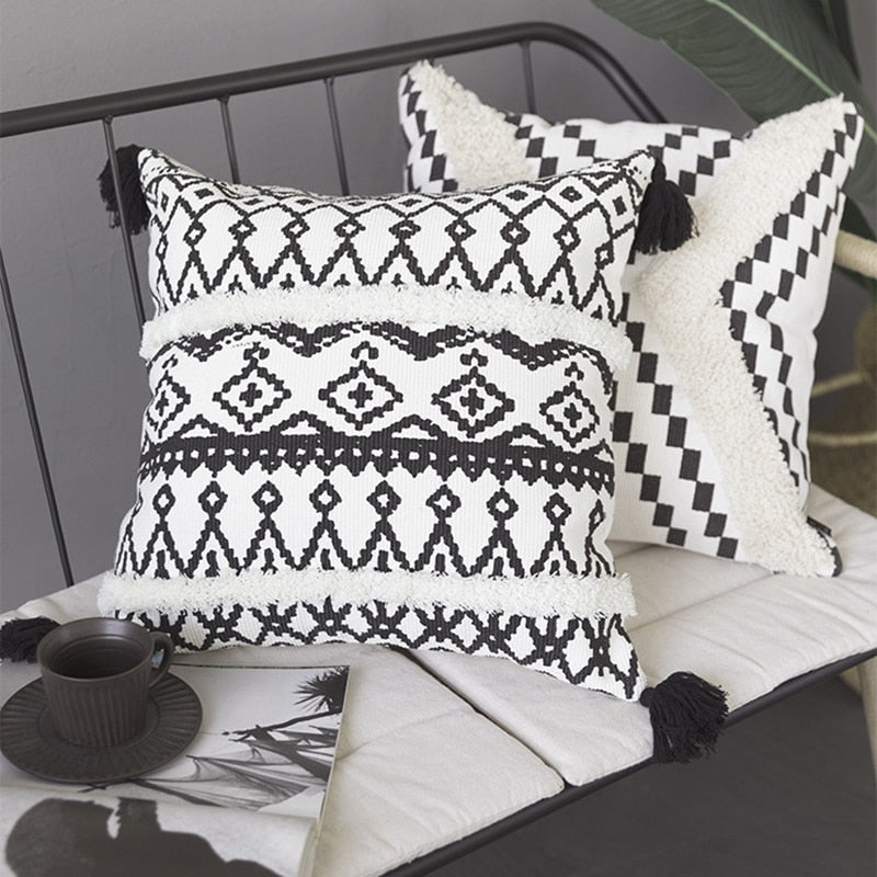 Black & White Geometric Boho Throw Pillow Cover w/ Tassels