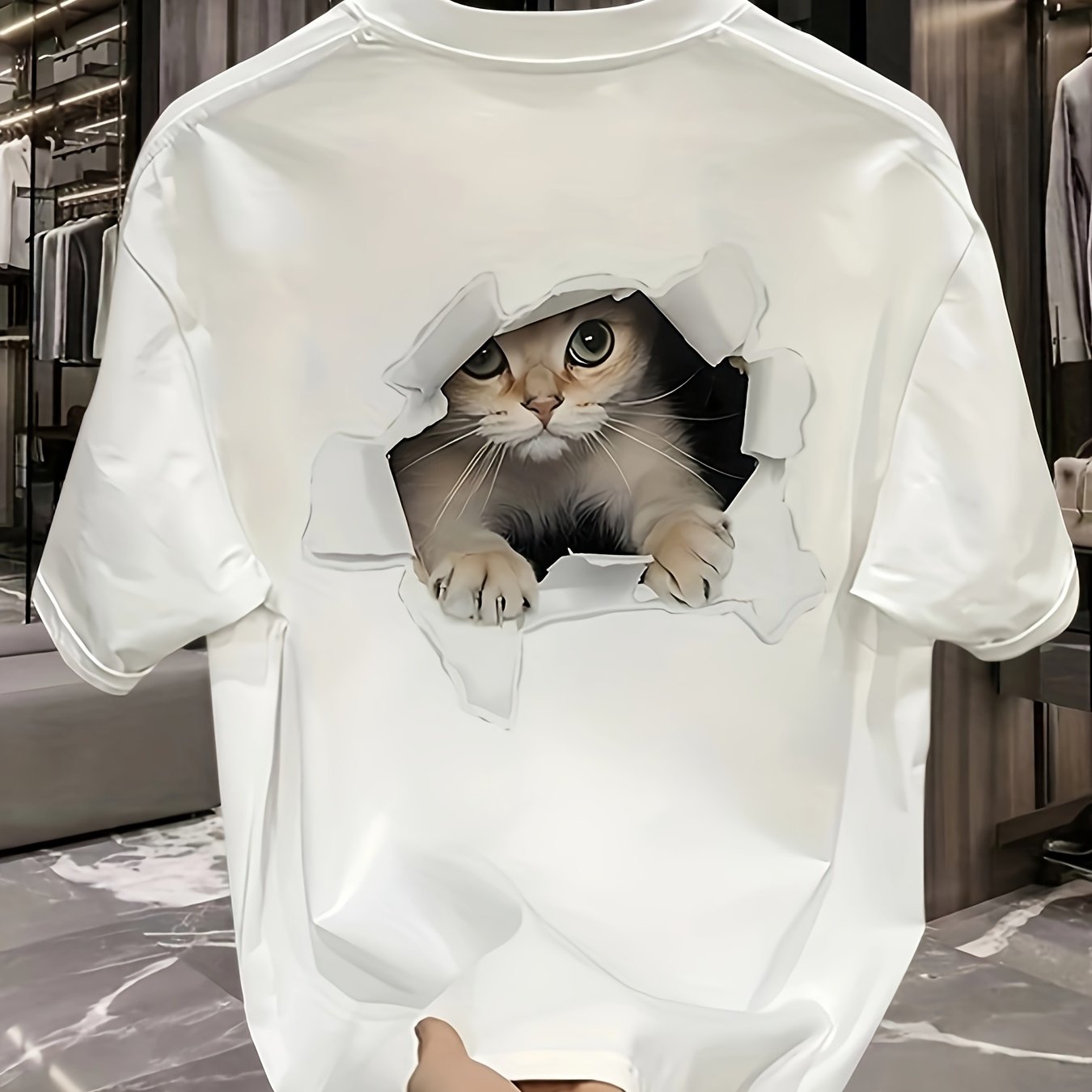 Cat Print Crew Neck T-shirt, Short Sleeve Casual Top For Spring & Summer, Women’s Clothing