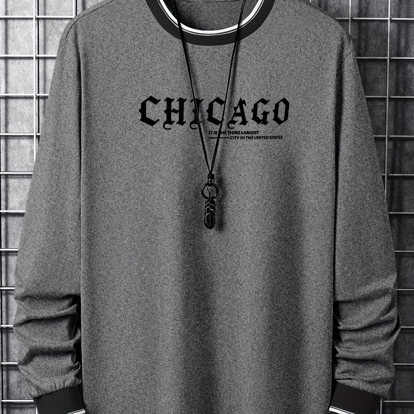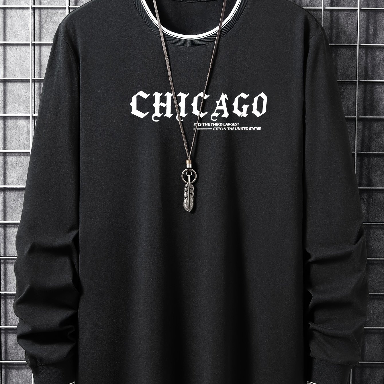 CHICAGO Print Men’s Street Daily Long Sleeve High Stretch T-shirt, Spring Fall Outdoor, Men’s Clothing