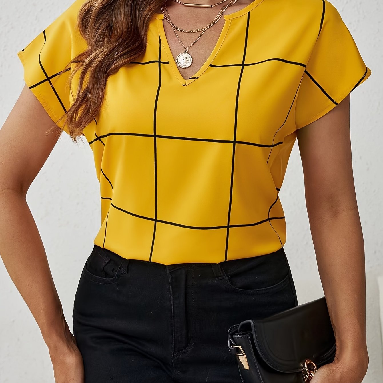 Plaid Print Notched Neck Blouse, Casual Short Sleeve Blouse For Spring & Summer, Women’s Clothing