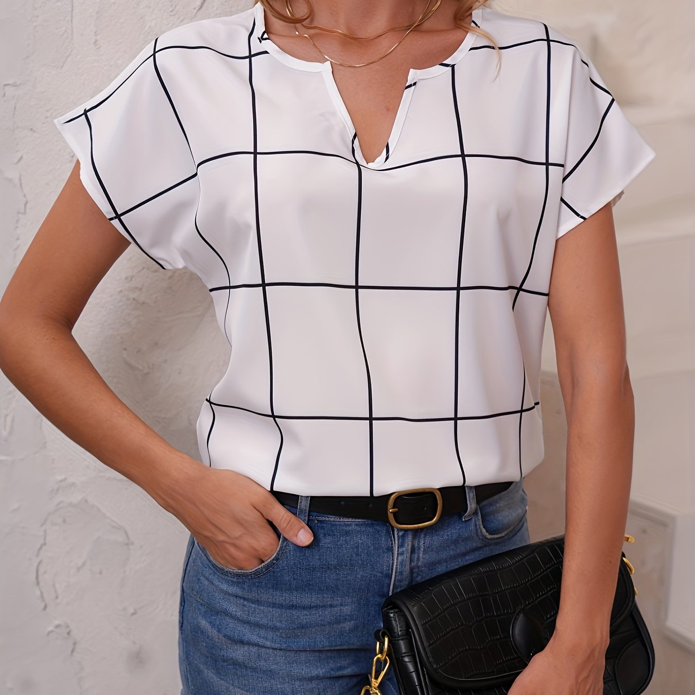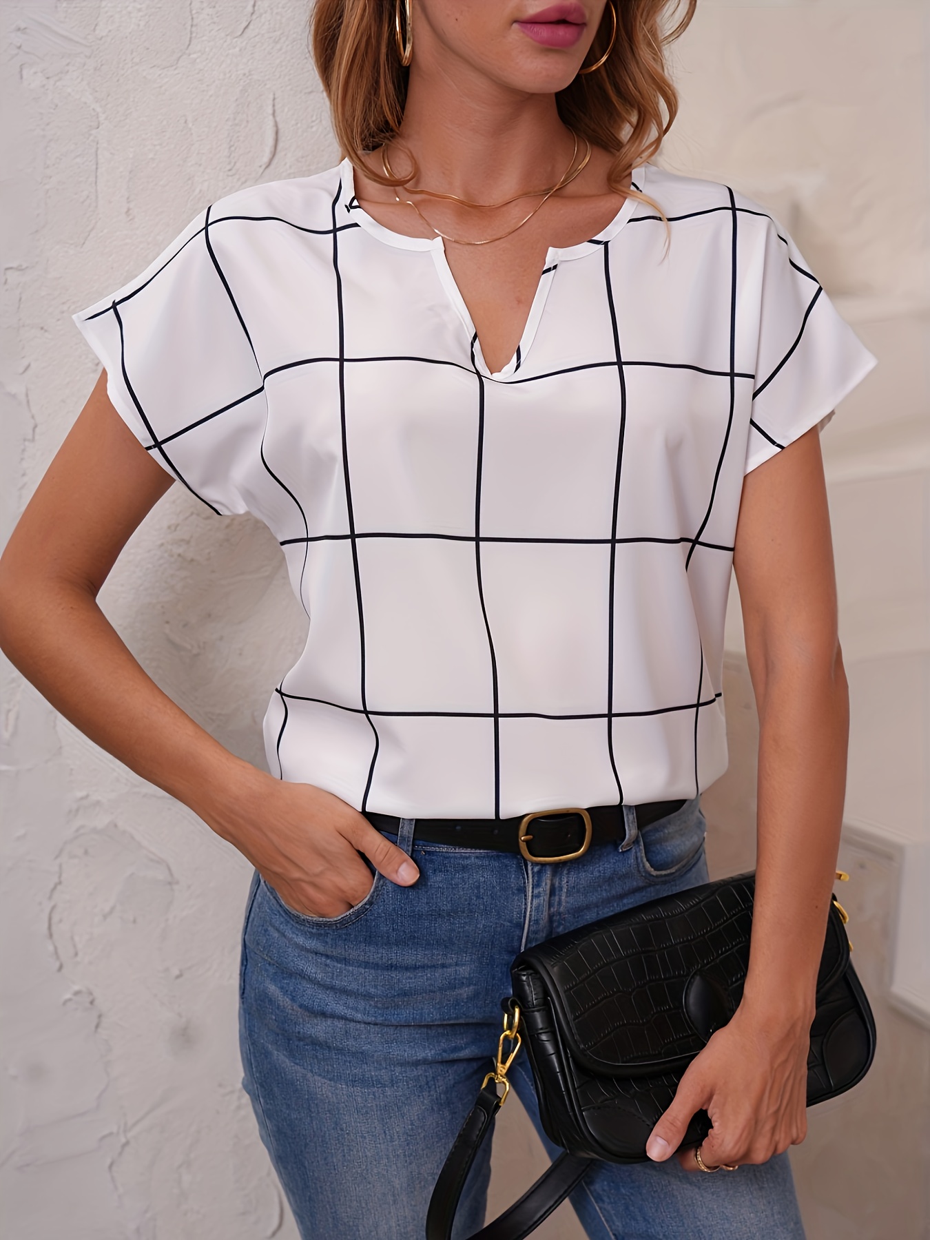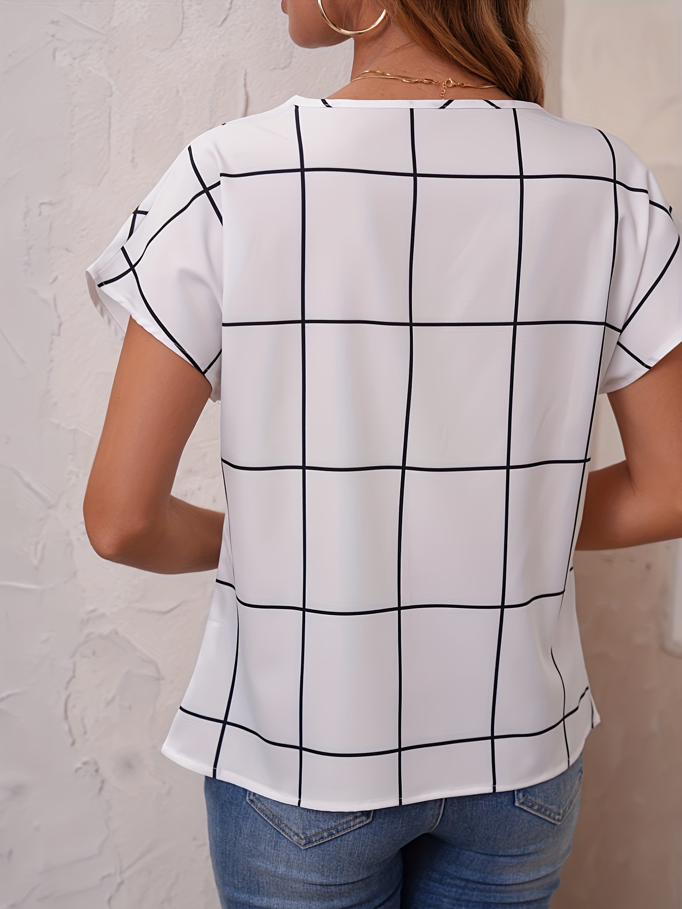 Be the first to review “Plaid Print V Neck Blouse, Short Sleeve Casual Blouse For Spring & Summer, Women’s Clothing” Cancel reply
