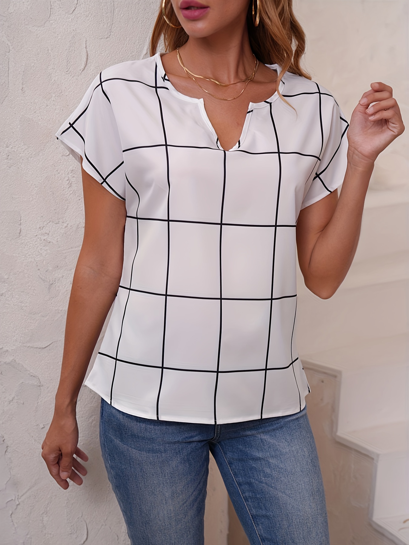 Plaid Print V Neck Blouse, Short Sleeve Casual Blouse For Spring & Summer, Women’s Clothing