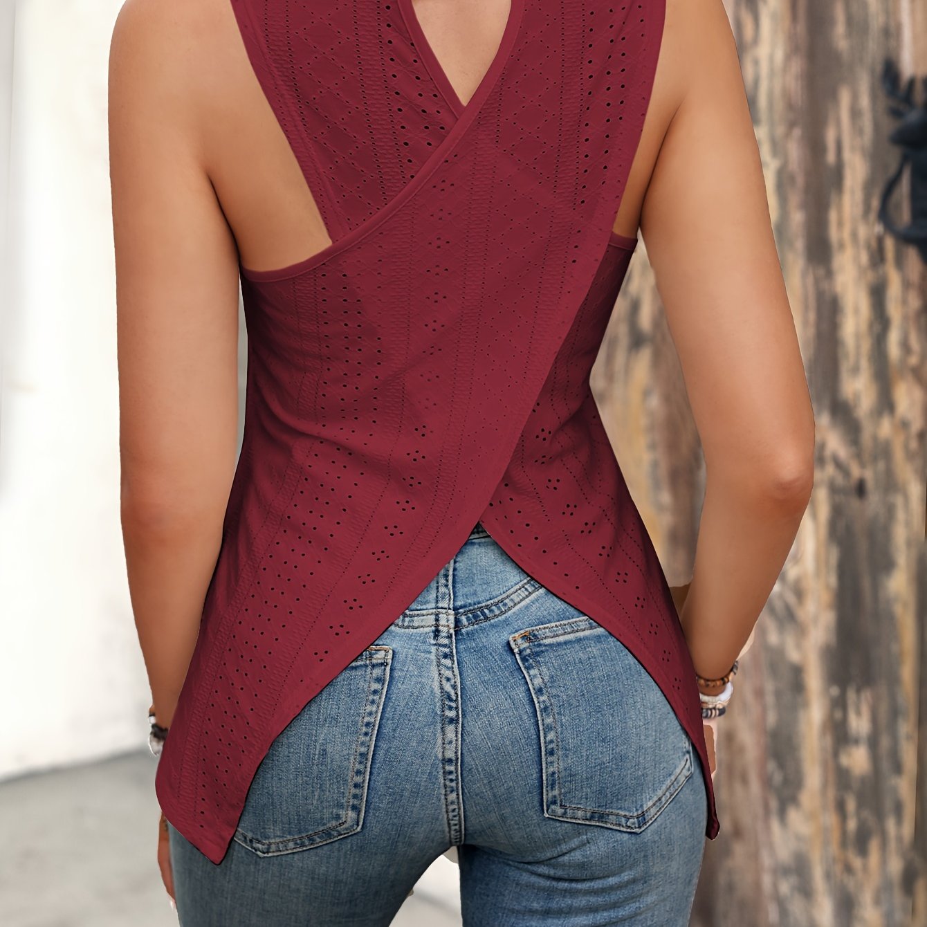 Solid Eyelet Crew Neck Tank Top, Versatile Sleeveless Tank Top For Summer, Women’s Clothing