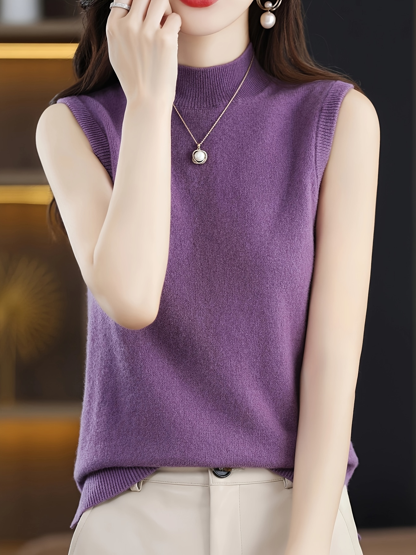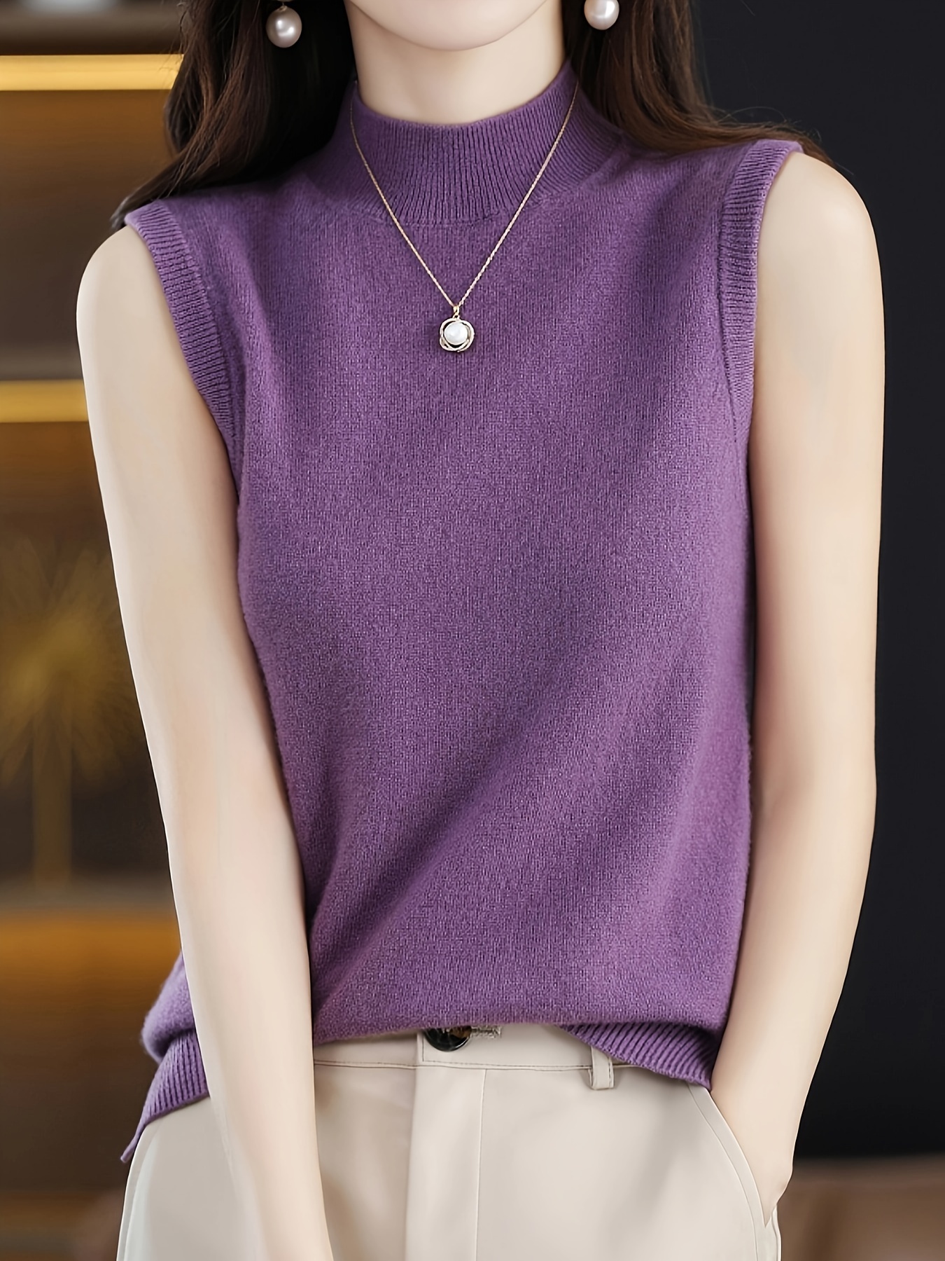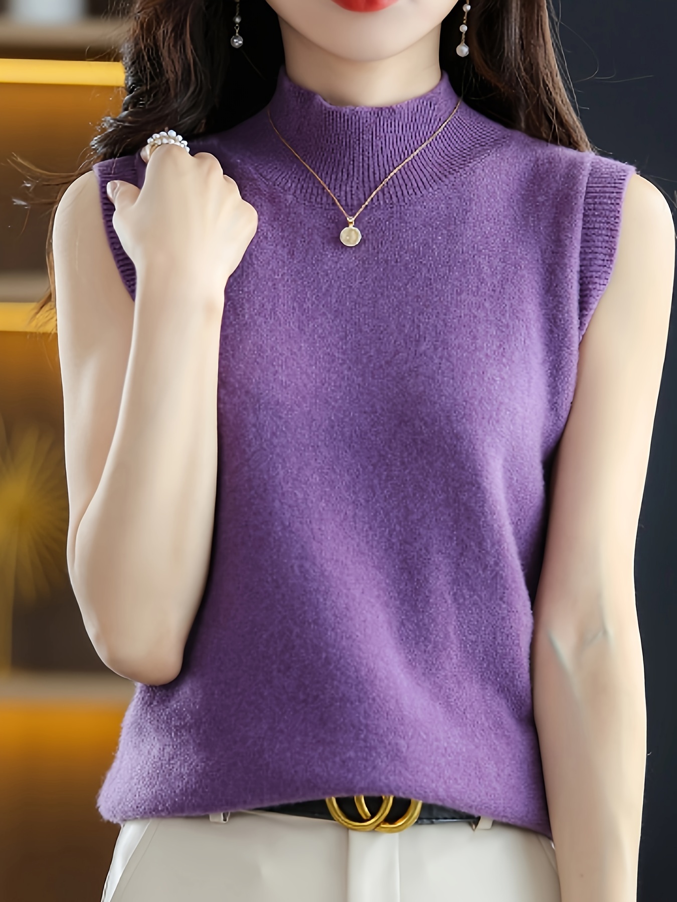 Solid Knit Mock Neck Tank Top, Casual Sleeveless Tank Top, Women’s Clothing