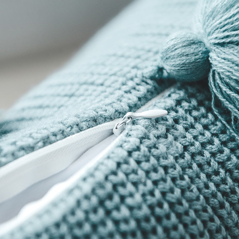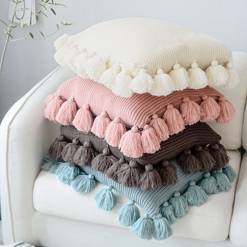 Solid Knitted Pillow Cover w/ Tassel Details: