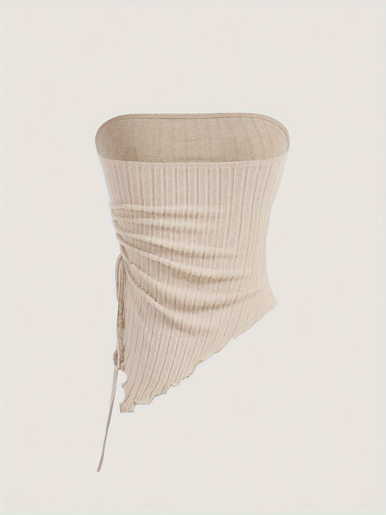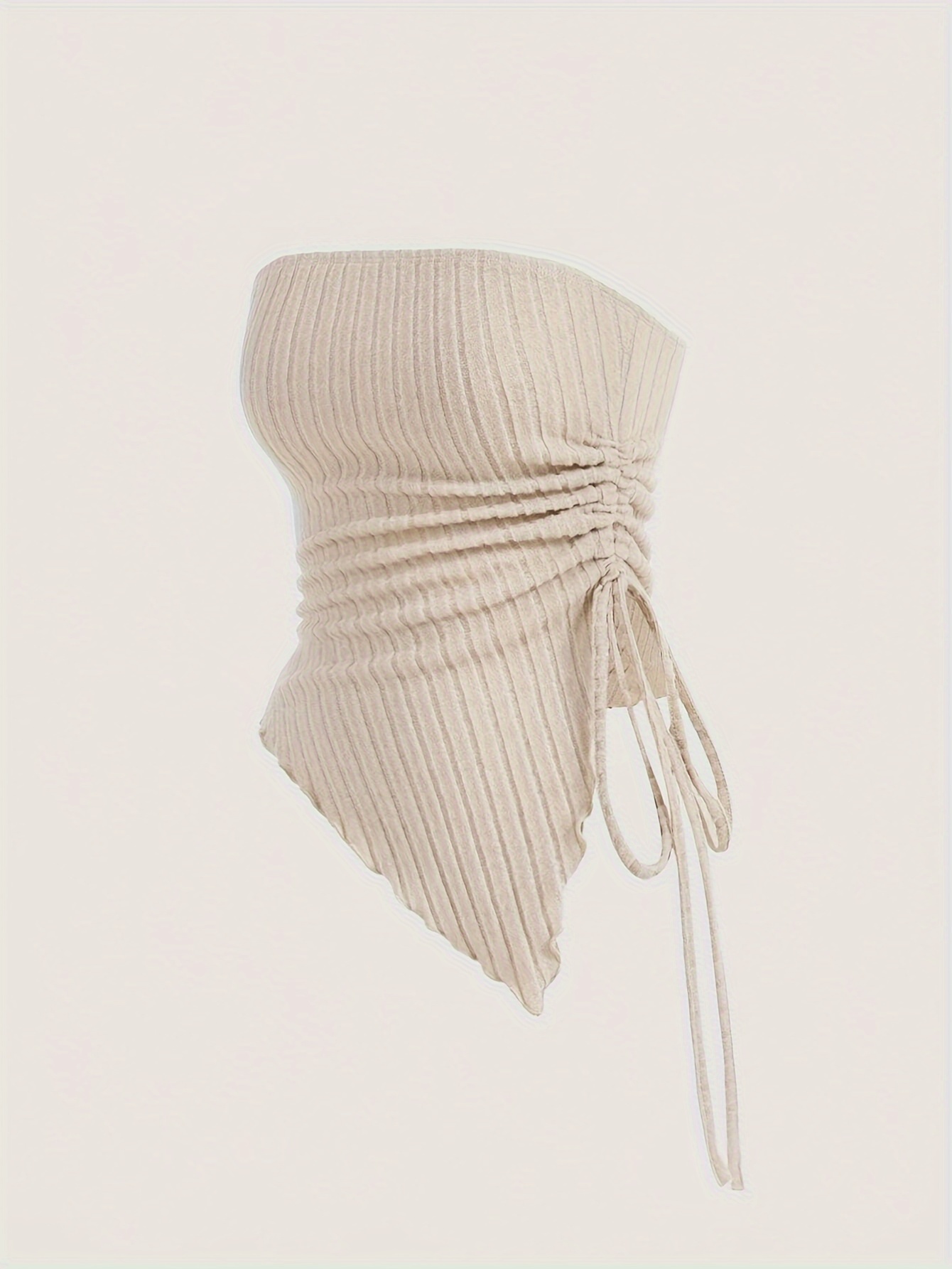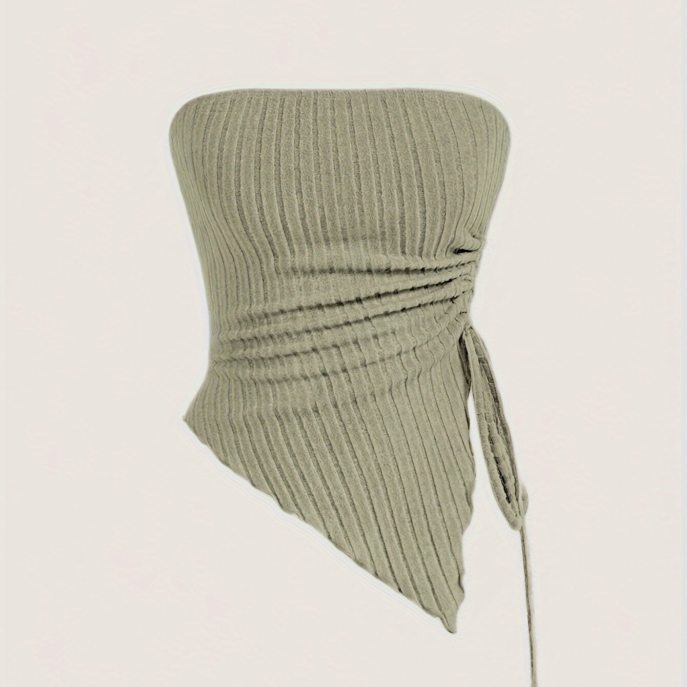 Solid Ribbed Asymmetric Hem Tube Top, Elegant Drawstring Ruched Side Strapless Sleeveless Top, Women’s Clothing