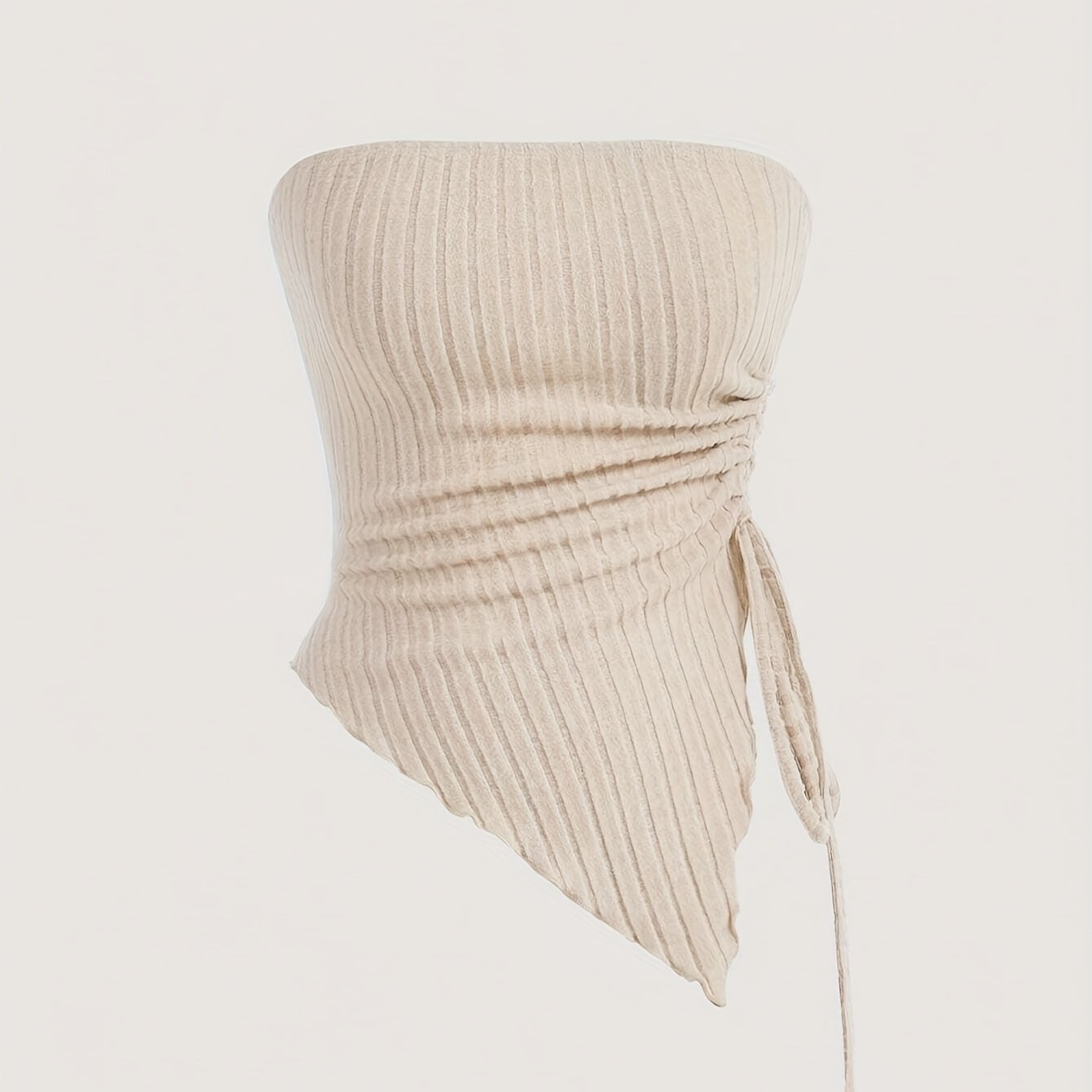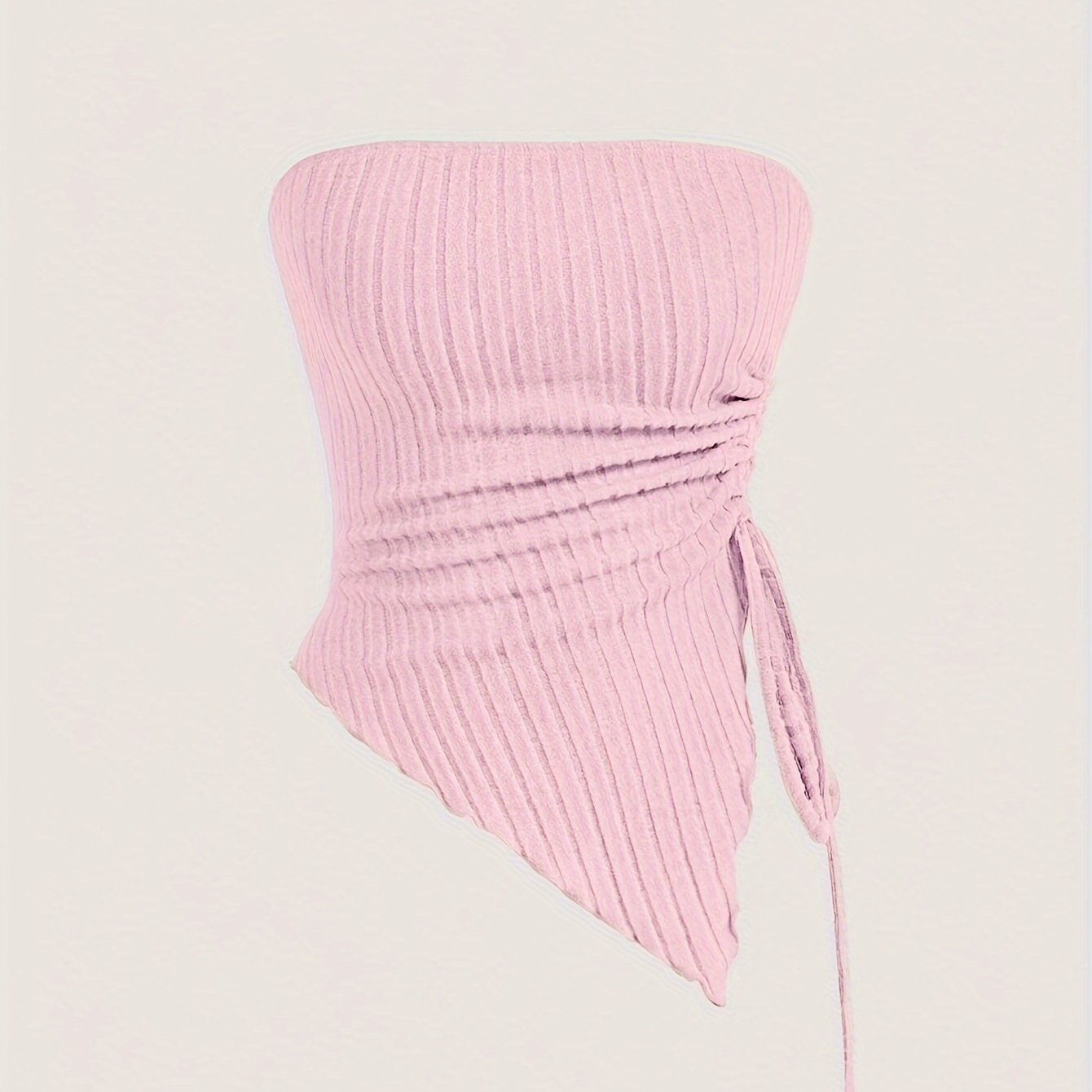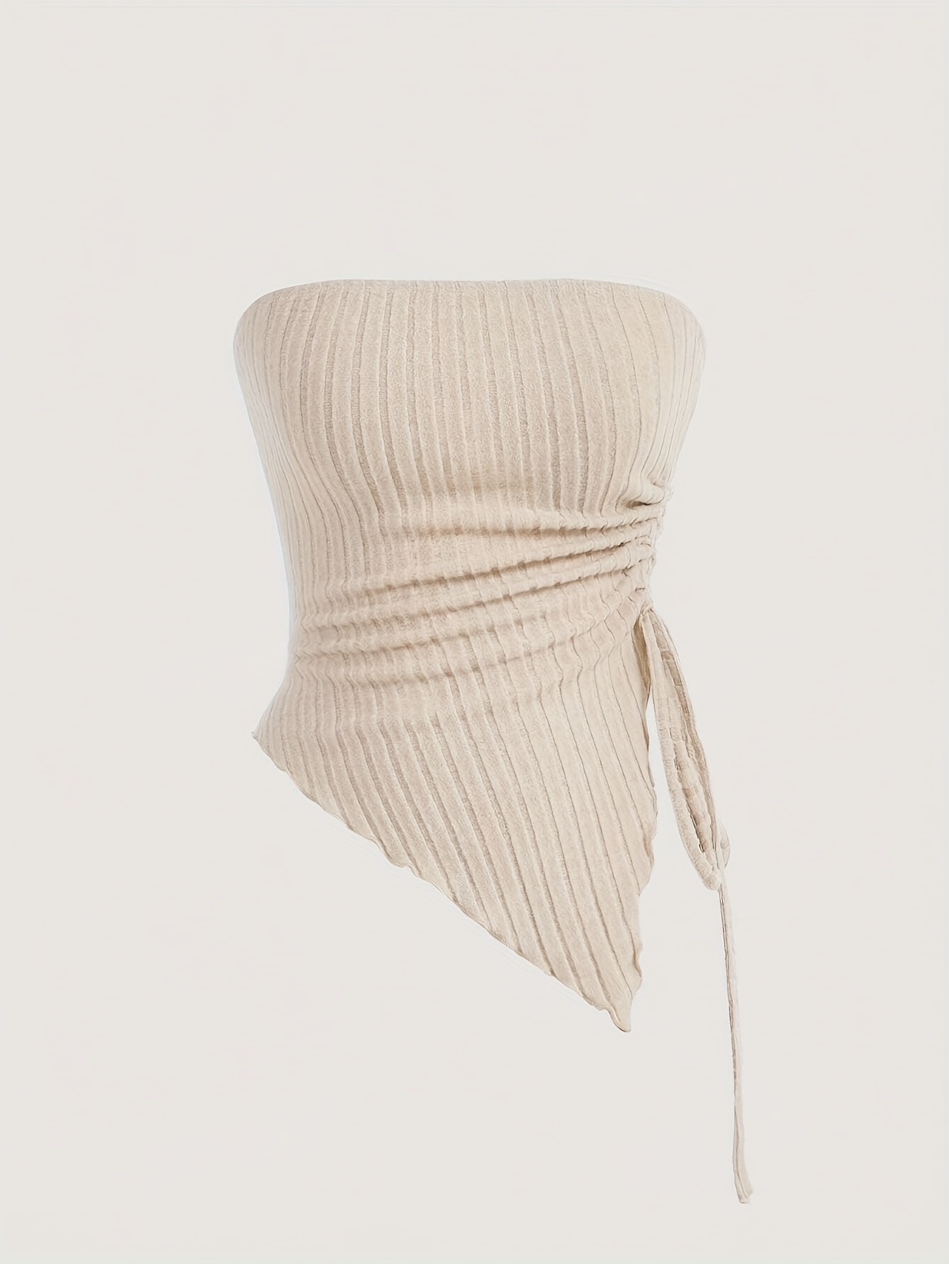 Solid Ribbed Asymmetric Hem Tube Top, Elegant Drawstring Ruched Side Strapless Sleeveless Top, Women’s Clothing