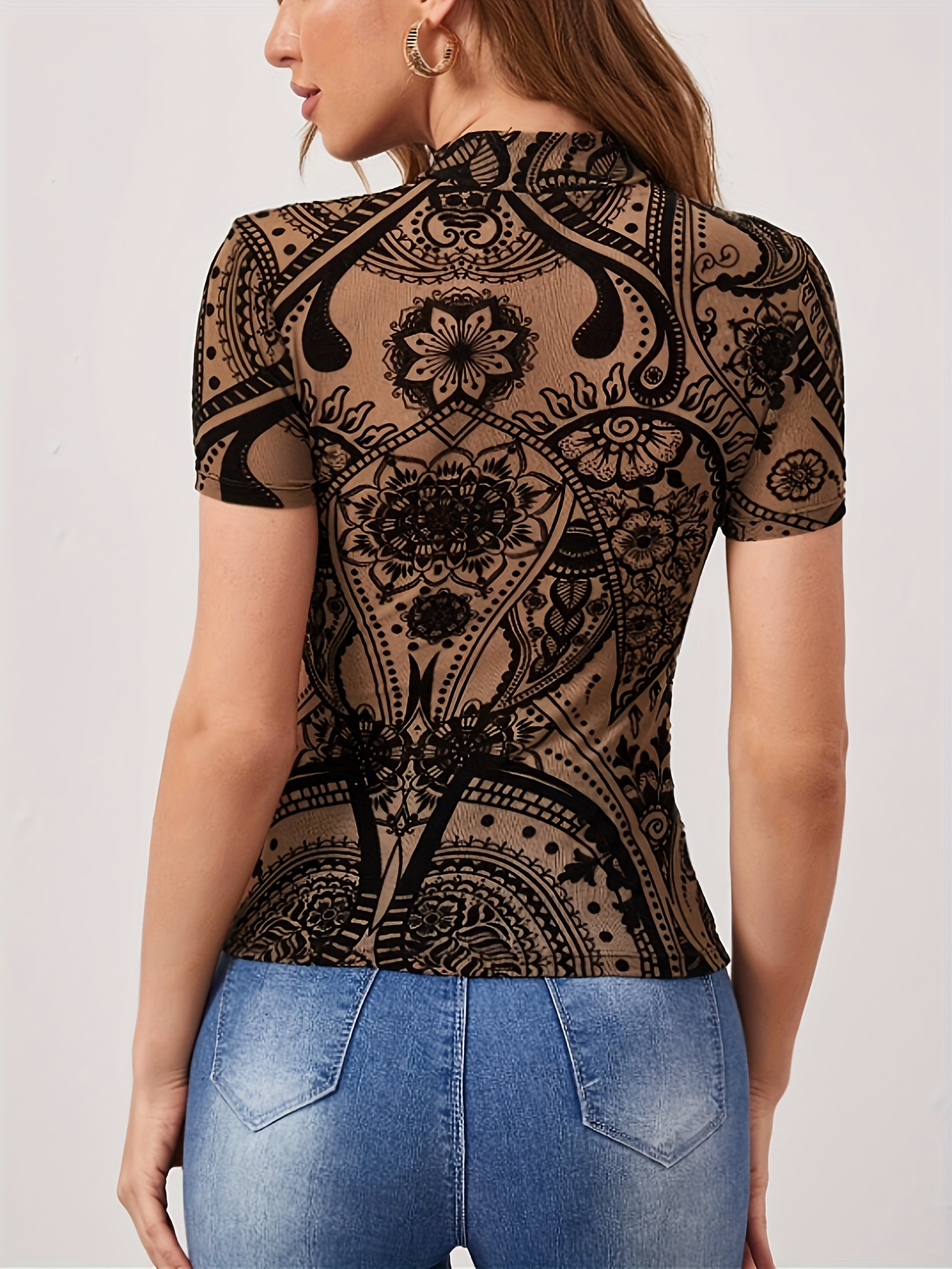 Vintage Floral Print Slim T-shirt, Vintage Short Sleeve Mock Neck Top For Spring & Summer, Women’s Clothing