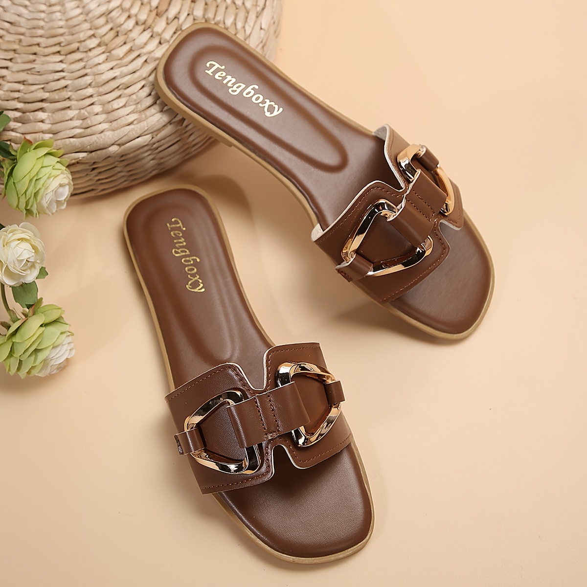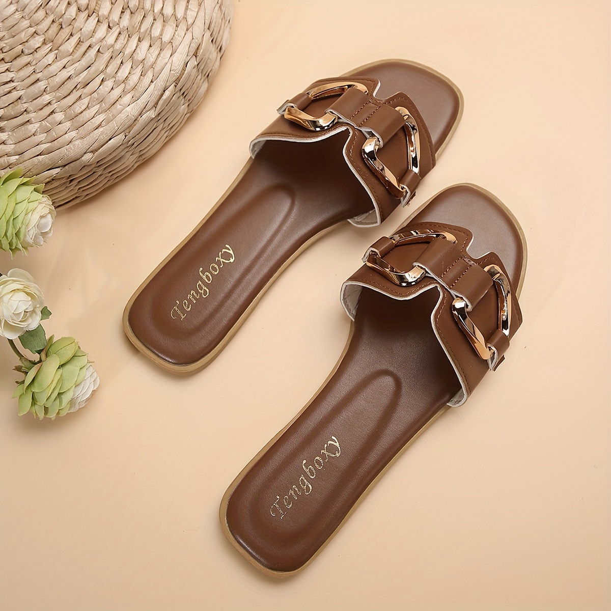 Women’s Metallic Buckle Decor Slides, Fashionable Square Open Toe Summer Shoes, Casual Beach Flat Slides